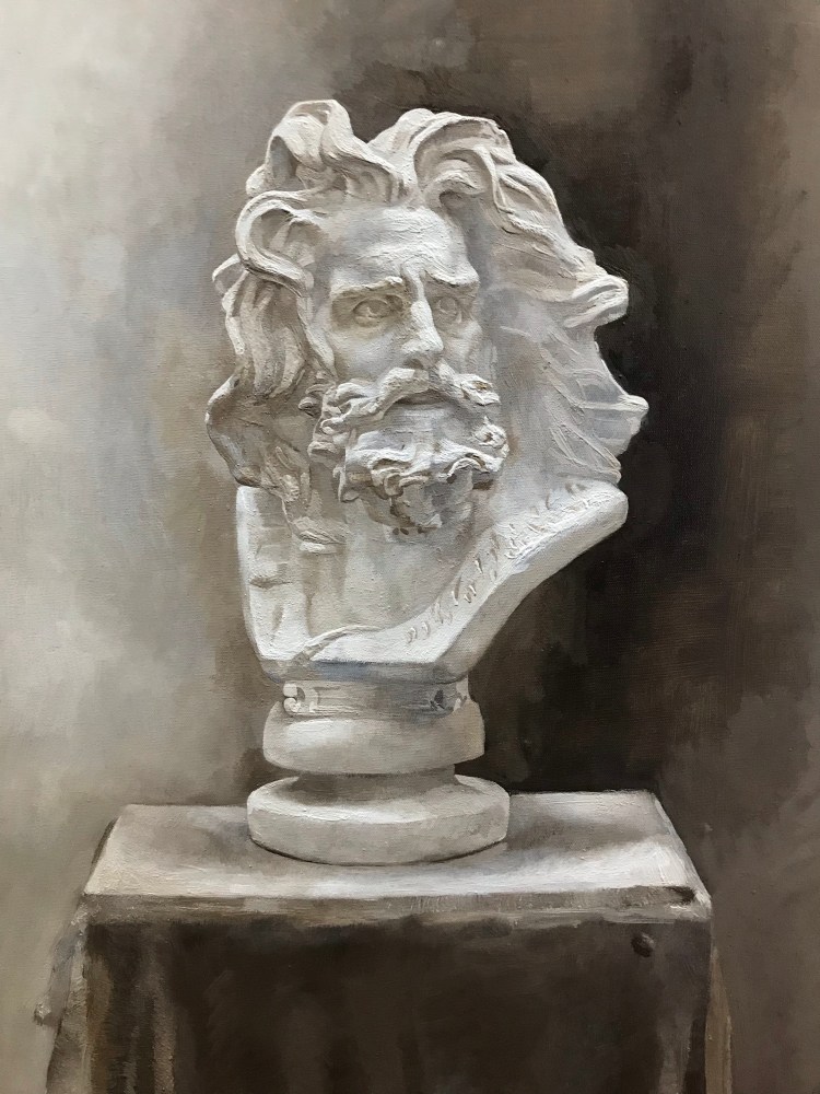 Study of a cast in oil on canvas. The cast is of a “Marseille Warrior” from the Arc de Triomphe in France. I used an opaque grisaille technique. The pigments I used were lead white and raw umber, and I added calcium carbonate chalk to the lead white. The initial drawing was loose, and I gradually and slowly added smaller shapes on top of the rough base. I was using observation to a great extent to determine the shapes rather than construction, and in retrospect this may explain why it felt like the painting was progressing so slowly. However, I am convinced that Rembrandt likely used opaque grisailles in his paintings, and it is said that Rembrandt also painted quite slowly at times, so maybe I shouldn’t be disconcerted that this painting took a while.