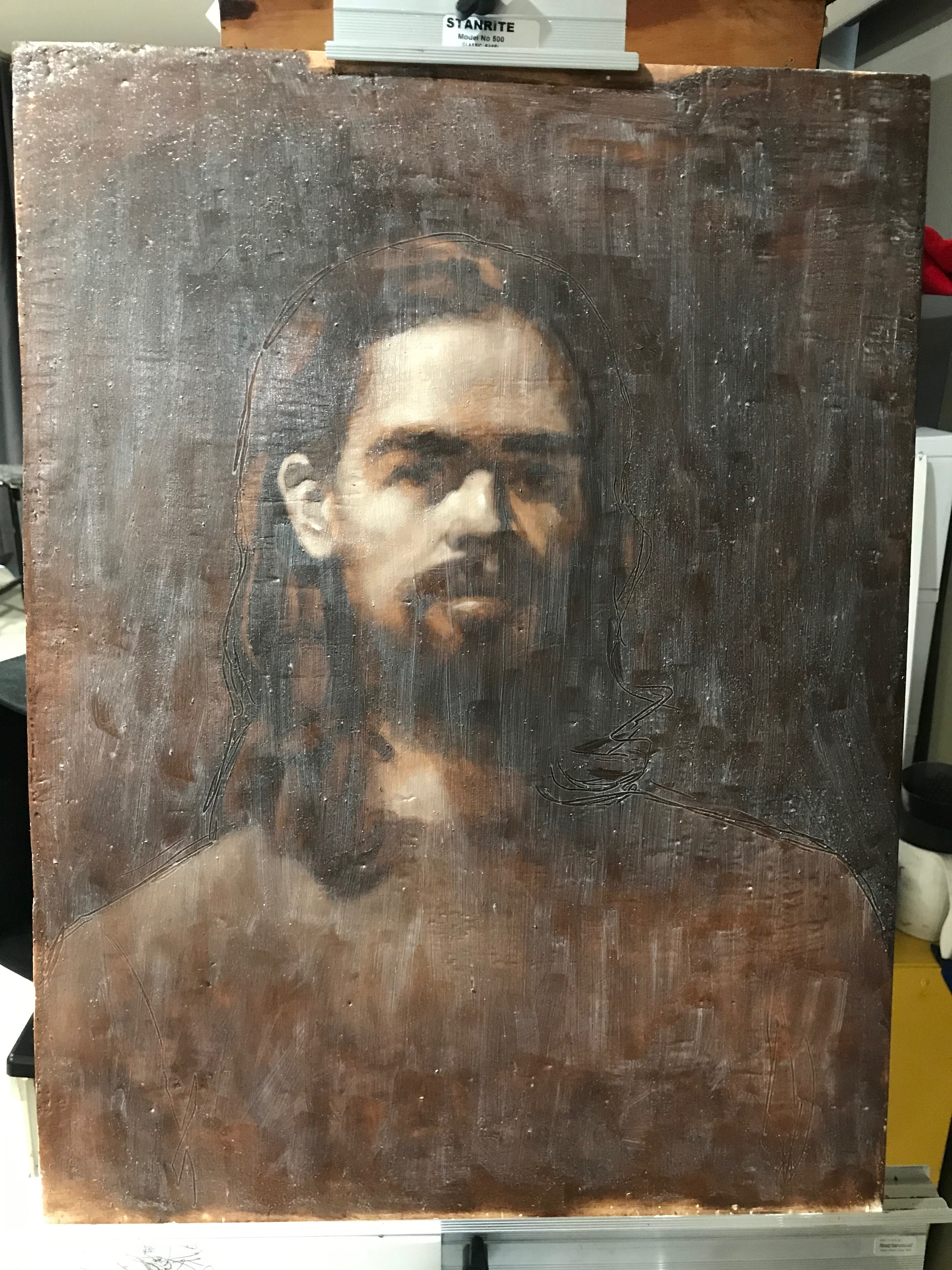 Yesterday I decided to paint a self portrait while the atelier is empty for the holidays. I took photos of each step of the process, to make it easier to retrospectively critique my technique. First, I made a drawing with charcoal, and red and white chalk. In the drawing I was paying attention to the three dimensional quality of form. The proportions are a bit off, but I don’t think that matters. I think mannerists like El Greco and Tintoretto do a good job of demonstrating how proportion doesn’t need to be accurate in a traditional sense, yet they show great care to proportion as it relates to flow, and rhythm. After I made the drawing, I made an underpainting, using the drawing as reference. I used a stain of umber for my underpainting, and then accented the lights with a scumble of lead white. I let that dry overnight, then I resumed painting today when the surface was dry. I spread a couch of calcium carbonate and linseed oil paste over the entire surface, to paint and glaze on top of.